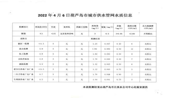 2022年4月6日葫芦岛市城市供水管网水质信息