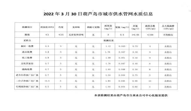 2022年3月30日葫芦岛市城市供水管网水质信息