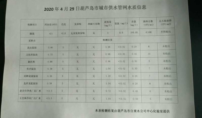 2020年4月29日葫芦岛市城市供水管网水质信息