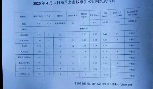 2020年4月8日葫芦岛市城市供水管网水质信息