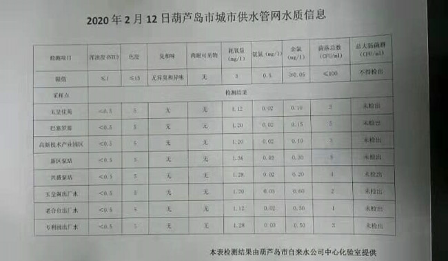 2020年2月12日葫芦岛市城市供水管网水质信息