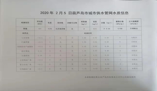 2020年2月5日葫芦岛市城市供水管网水质信息