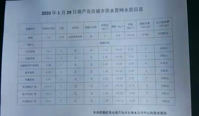 2020年1月29日葫芦岛市城市供水管网水质信息